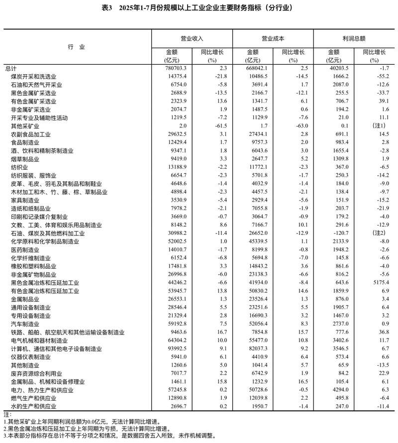 1—7月份,采矿业结束利润总和4930.9亿元,同比下落31.6%;制造业结束利润总和30235.8亿元,增长4.8%;电力、热力、燃气及水分娩和供应业结束利润总和5036.8亿元,增长3.9%。