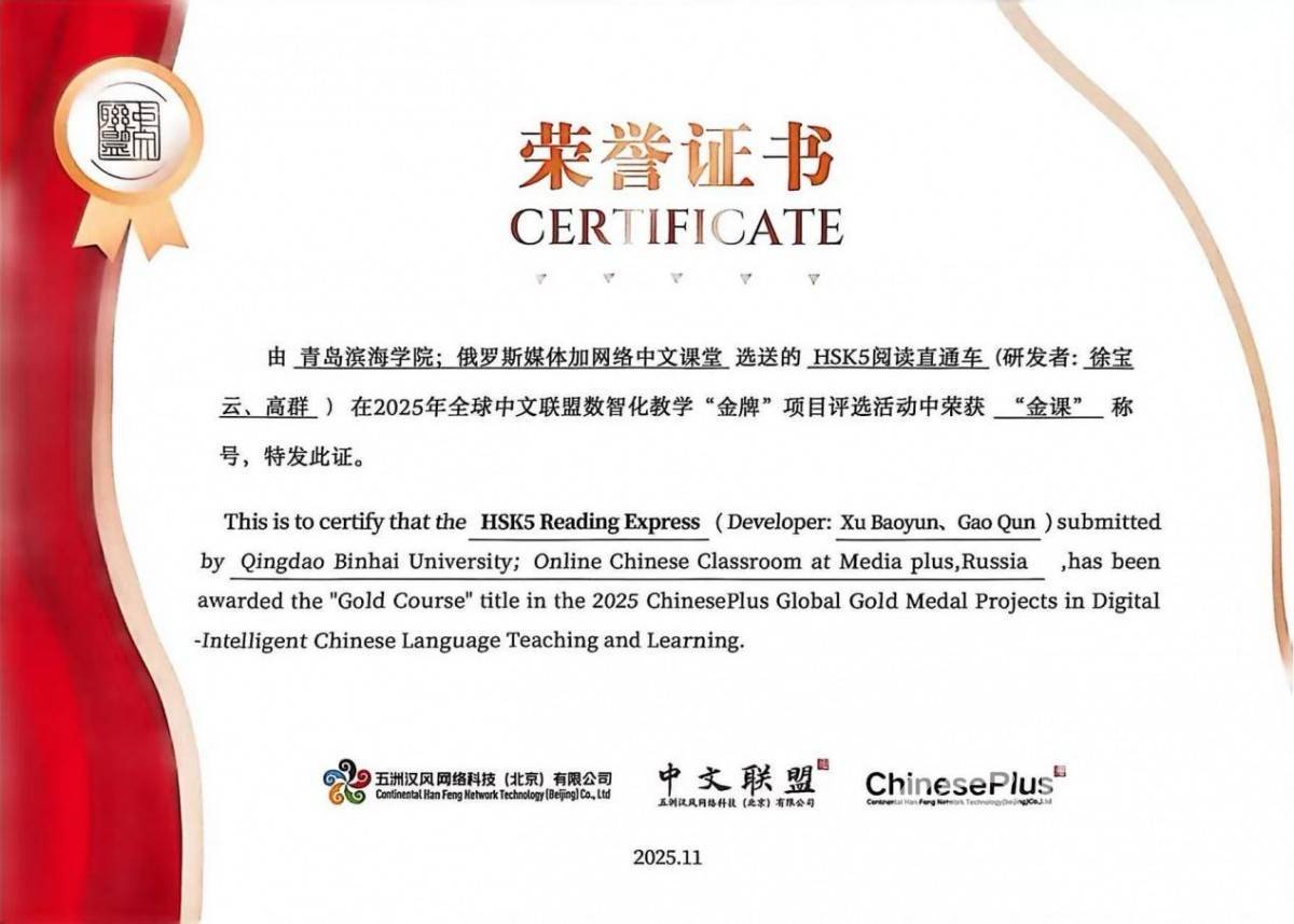 信网11月18日讯 11月14日-16日,由中国解说部主持,解说部中外谈话调换融合中心、中国外洋华文解说基金会、宇宙汉语教学学会共同经办的2025宇宙华文大会在北京举行。来自寰球160多个国度和地区的解说左右部门、中外高校持重东谈主、驻华使节等近2000东谈主参与。由青岛滨海学院与俄罗斯媒体加麇鸠合文课堂共同陶冶的《HSK5阅读纵贯车》课程在2025寰球华文定约数智化教学“金牌”神志评比步履中荣获“金课”奖项。